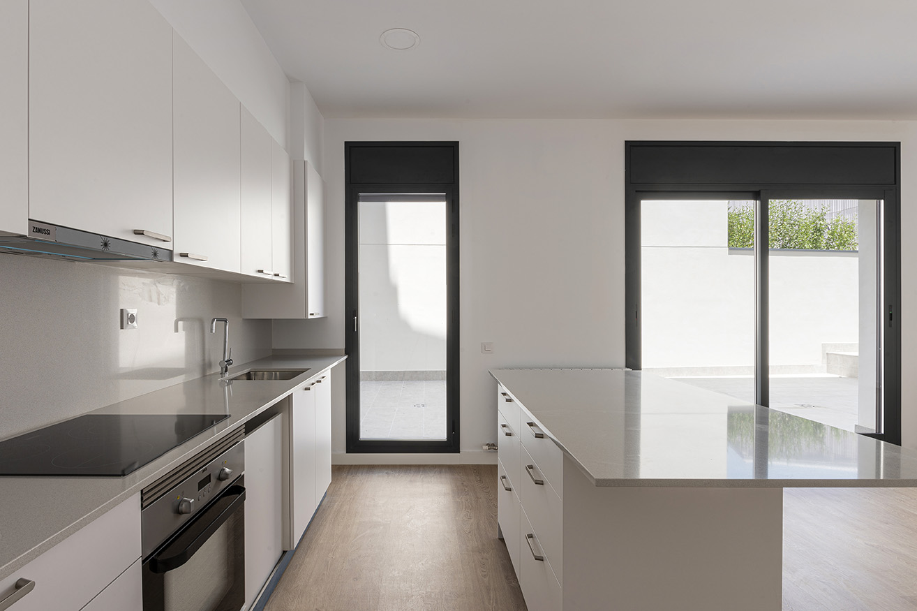 • Cuina: Silestone a la zona que hi ha mobles de cuina alts juntament amb l’encimera, la resta de paraments acabats amb guix i pintura.