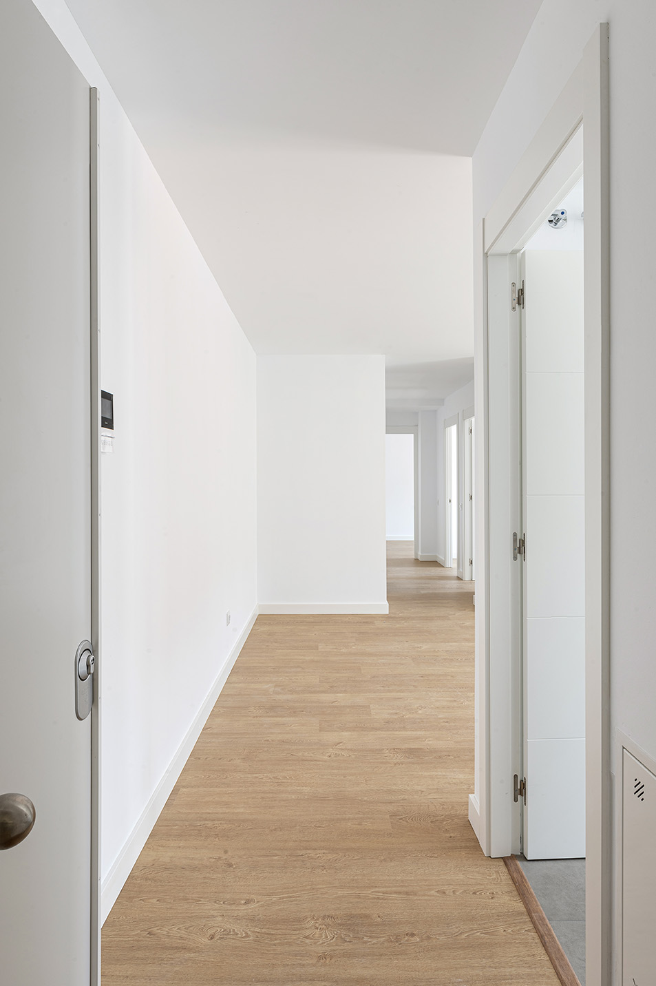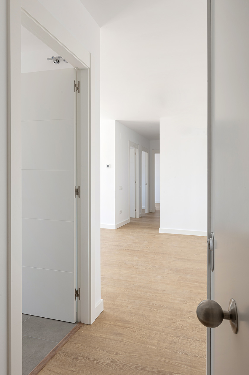 • Porta d’entrada a l’habitatge blindada, xapada amb fusta pre-composat de roure, amb pany de seguretat amb tres  punts d’ancoratge, tirador i espiell.
